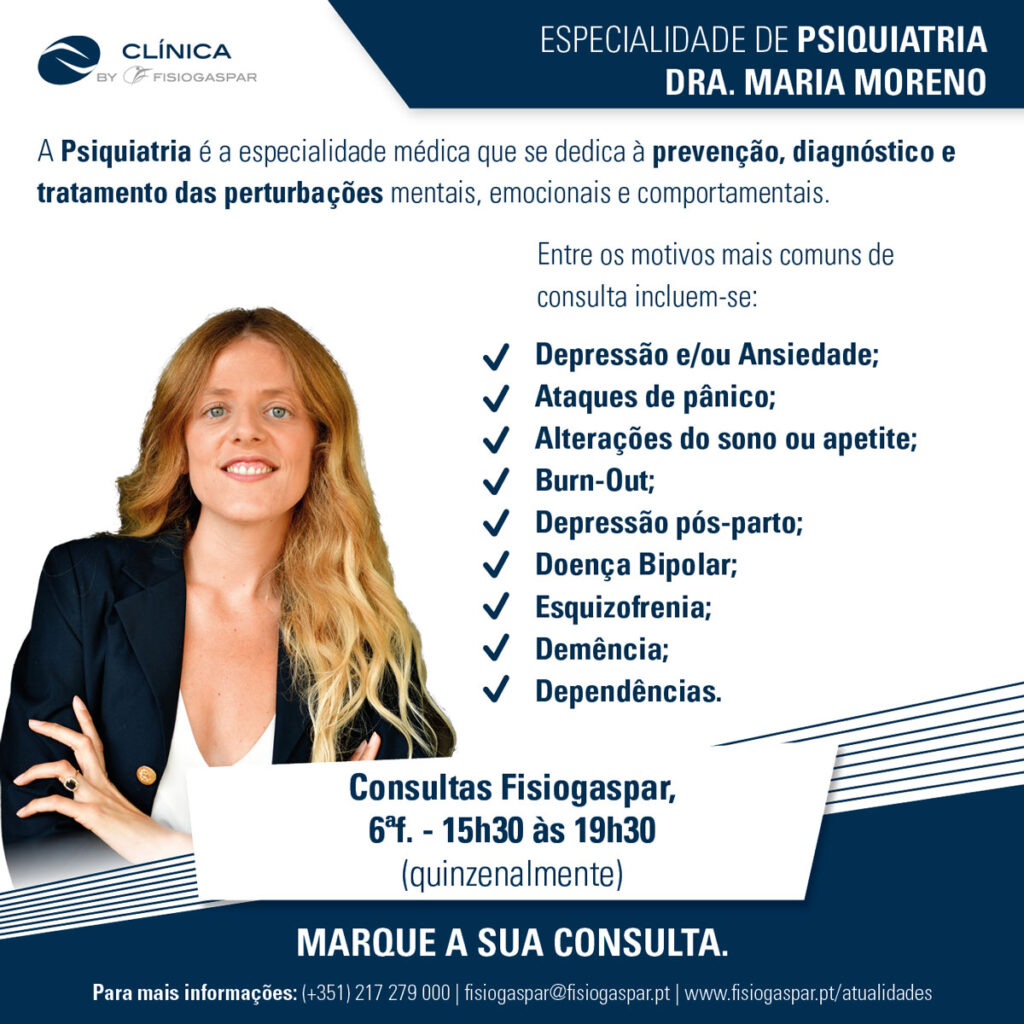 A Dra. Maria Moreno integra a nossa equipa clínica assegurando a Consulta de Psiquiatria.