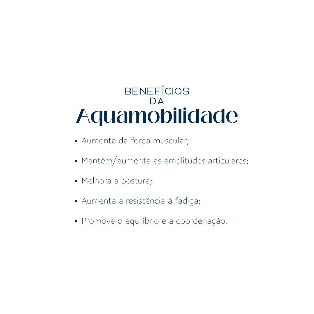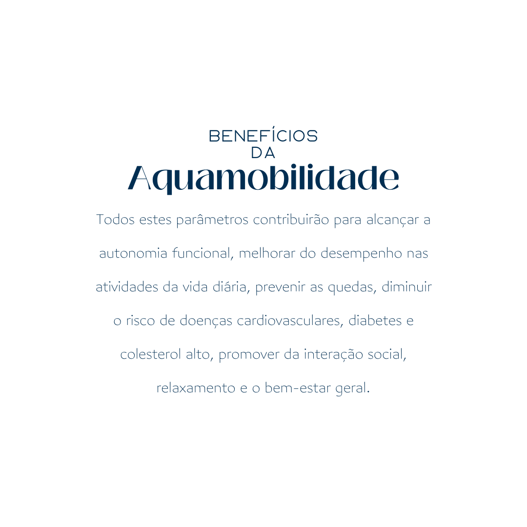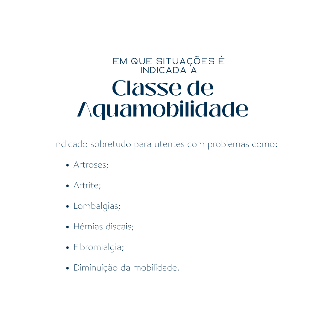 As classes de aquamobilidade, através de exercícios simples de baixo impacto e baseados nas atividades do seu dia-a-dia, promovem uma melhoria na sua mobilidade geral e na sua qualidade de vida.