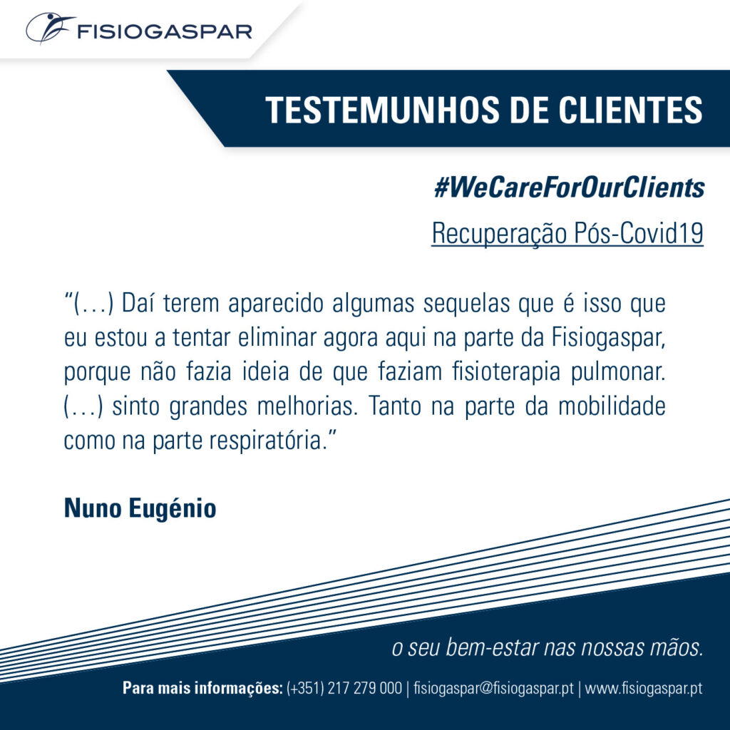 Um amigo referenciou a Fisiogaspar e veio fazer uma consulta de avaliação e de imediato iniciou a sua recuperação e reabilitação na Fisiogaspar, com foco nas sequelas físicas pós-covid19. Passados dois meses já se encontra bem melhor, mas continua em tratamentos e exercícios. O Nuno Eugénio percebeu que tem de tratar da sua saúde, controlar o stress e ser mais saudável. Alerta todos os que com ele se cruzam da importância de fazer os seus exames e avaliação física pós-Covid19, mesmo aqueles que durante a doença foram assintomáticos.