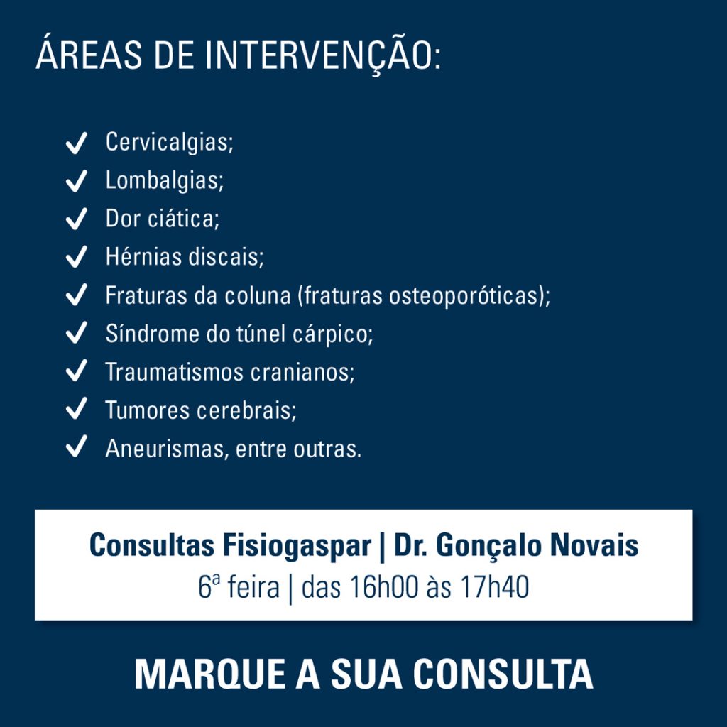 O Dr. Gonçalo Novais, assegura a consulta de Neurocirurgia e possui experiência no tratamento de patologia simples e complexa da coluna vertebral, bem como, em cirurgia minimamente invasiva da coluna vertebral e procedimentos percutâneos para o tratamento da dor na coluna.