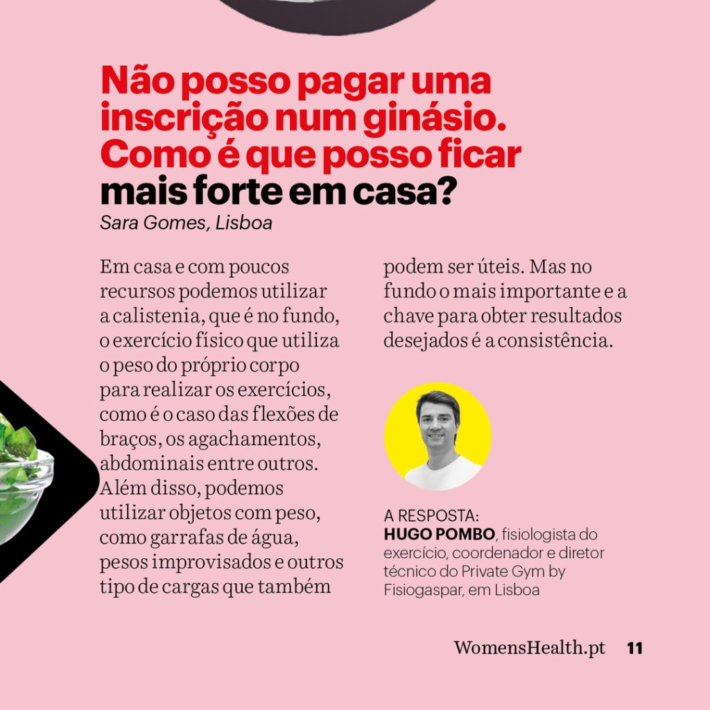 O fisiologista do exercício da Fisiogaspar, Hugo Pombo, esclarece a questão para a revista Women’s Health e identifica alguns exercícios que se podem fazer em casa para manter a forma física.