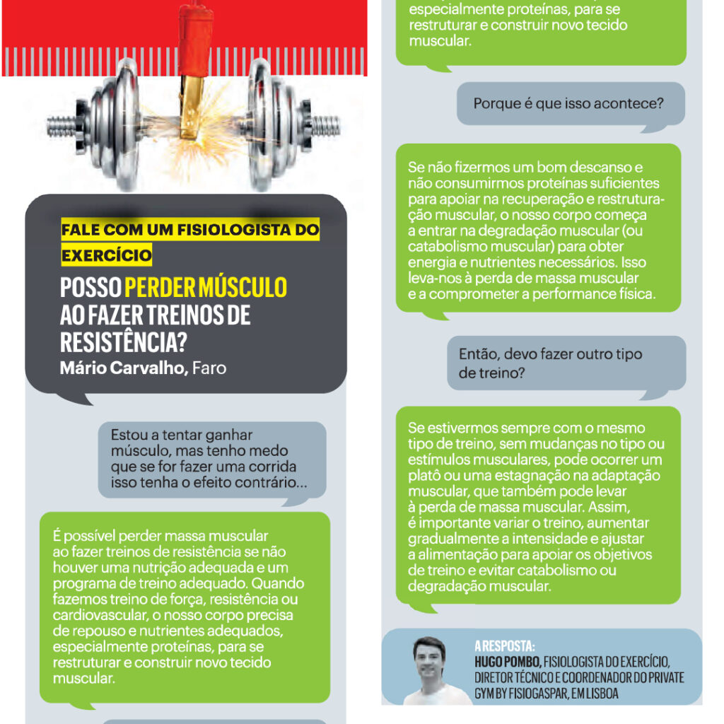 “É possível perder massa muscular ao fazer treinos de resistência se não houver uma nutrição adequada e um programa de treino adequado.”, explica o fisiologista Hugo Pombo.