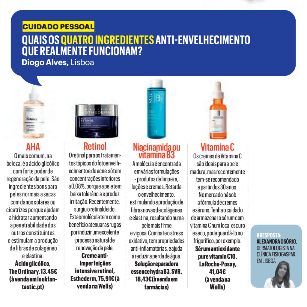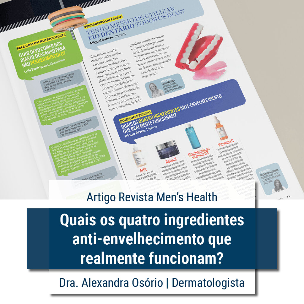 A Dra. Alexandra Osório, médica dermatologista na Fisiogaspar, escreveu um artigo para a revista Men’s Health, onde identifica quais os quatro ingredientes anti-envelhecimento que realmente funcionam.