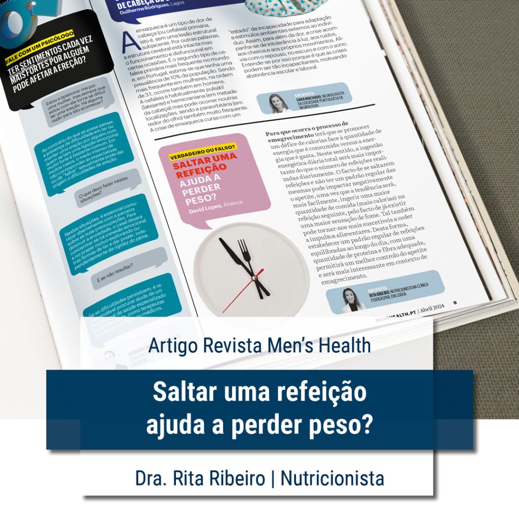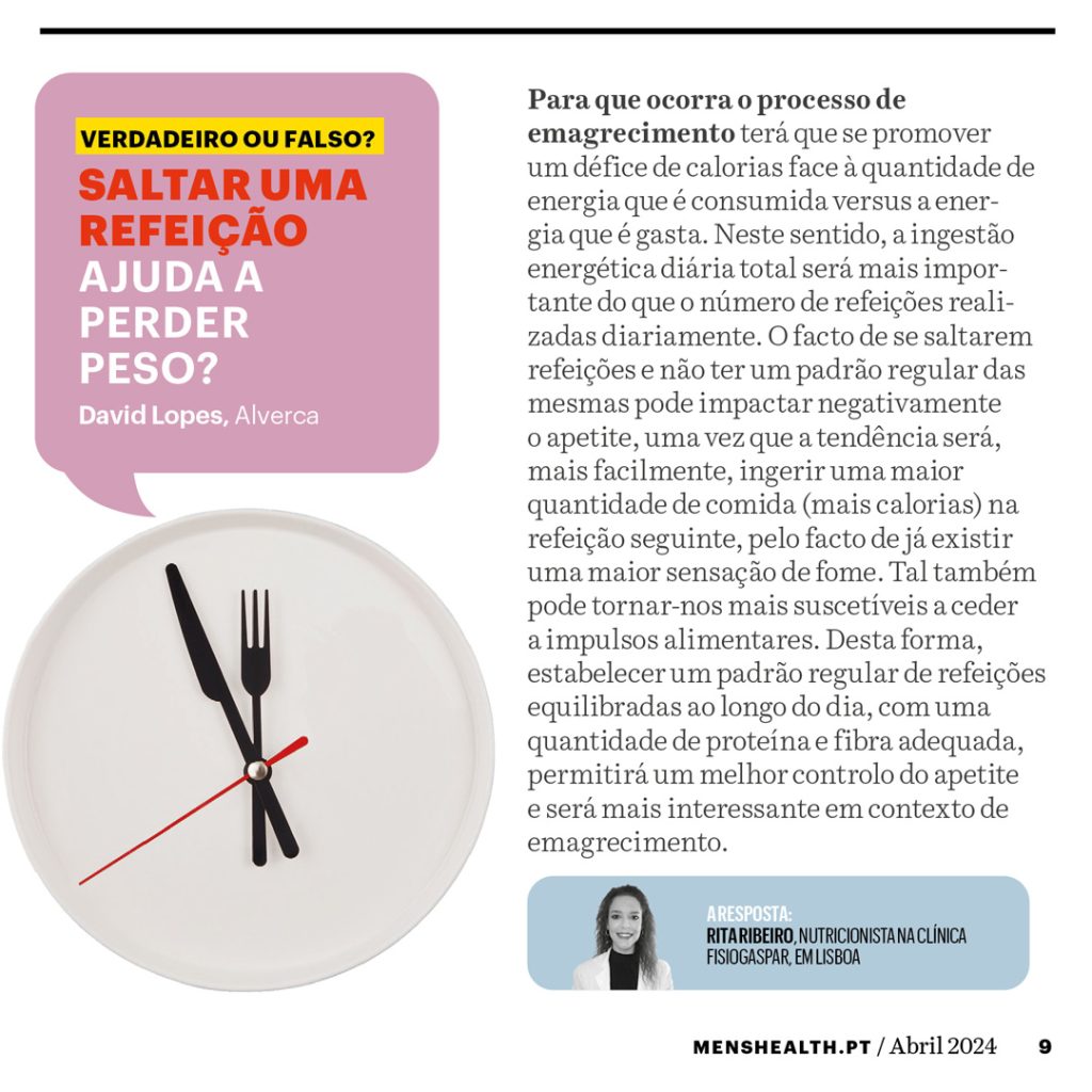 A nutricionista da Fisiogaspar Rita Ribeiro, esclarece a questão sobre se saltar refeições ajuda a perder peso, à revista Men’s Health.